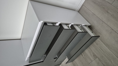 Komodos konstrukcijoje yra keturi ištraukiami stalčiai ant patvarių teleskopinių bėgelių, kurie užtikrina tylų ir sklandų atidarymą.